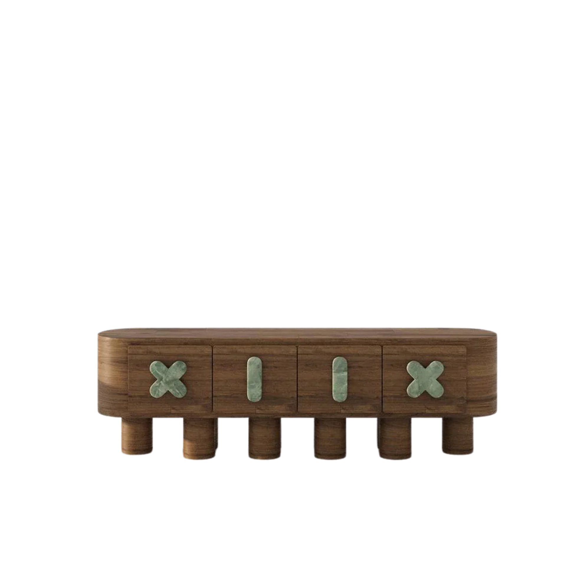 The Artevo TV Stand is a bold reinterpretation of modern luxury, designed to anchor your living space with sculptural form and contemporary flair. Crafted with a rich walnut veneer and accented by green marble handles in distinctive X and I shapes, this piece merges functionality with artistic detail. Its ten cylindrical legs give it a grounded presence while the rounded silhouette softens the overall aesthetic, making it a conversation-starting centerpiece in any modern home.