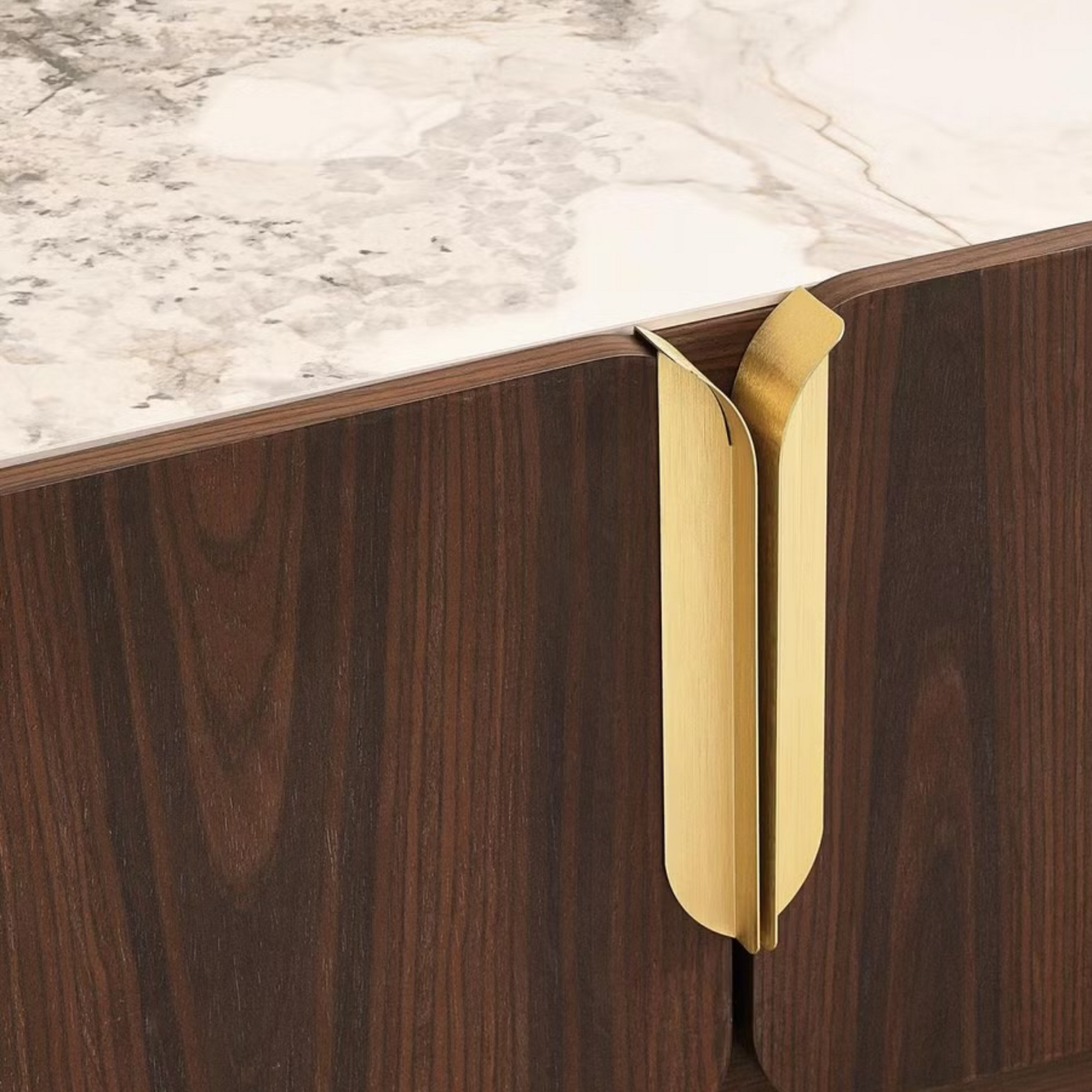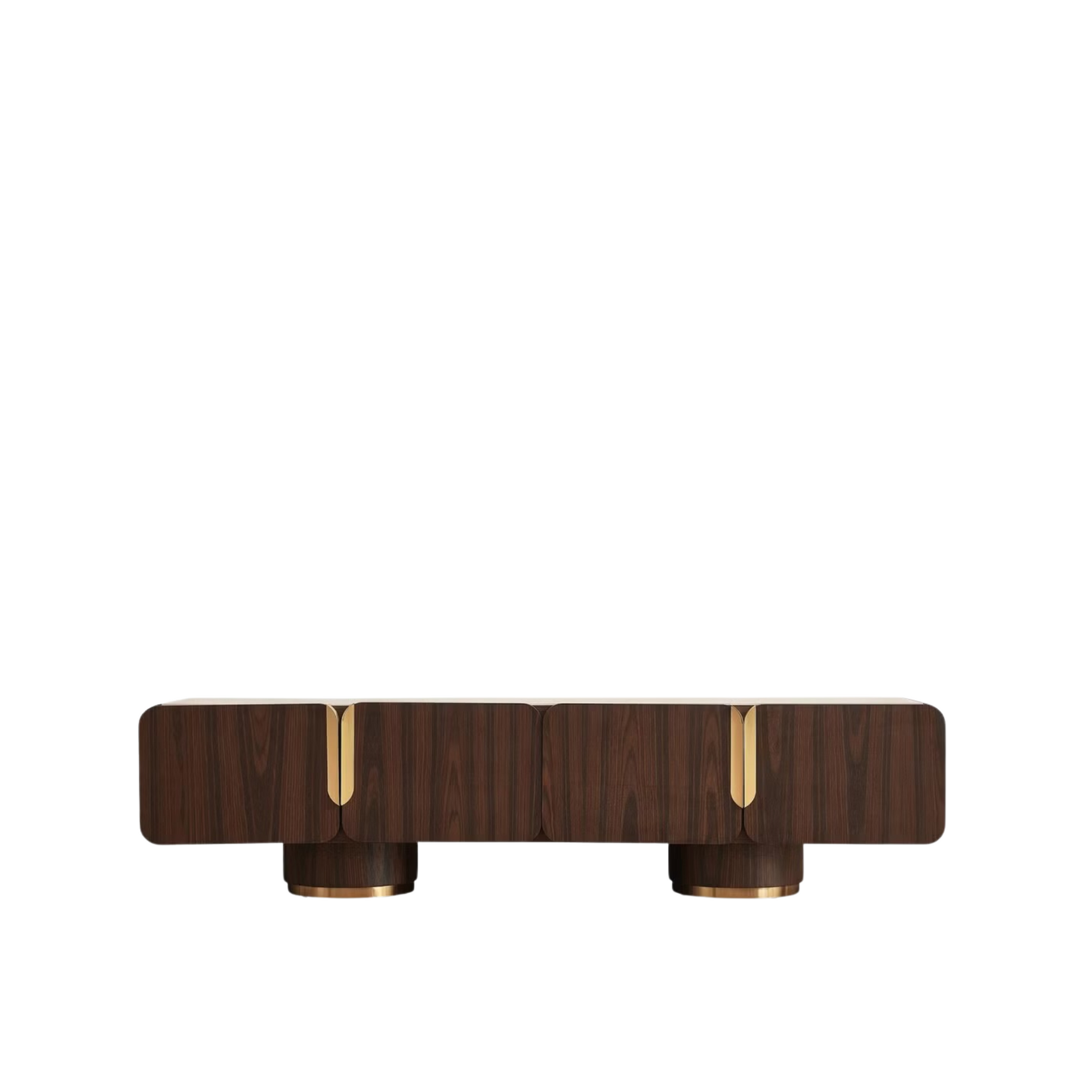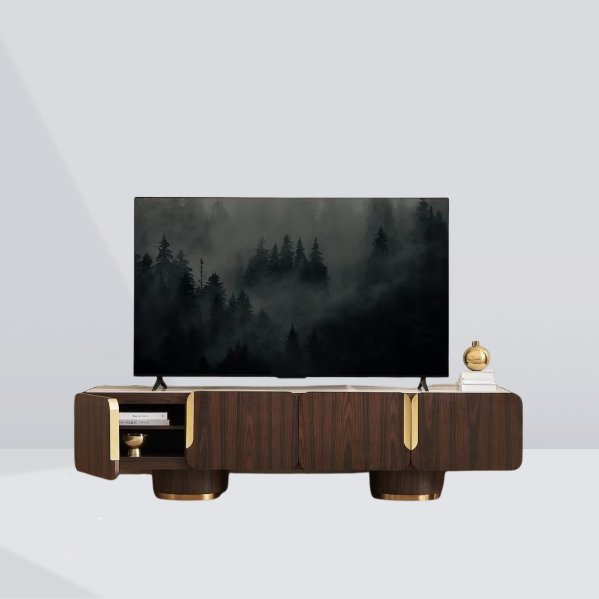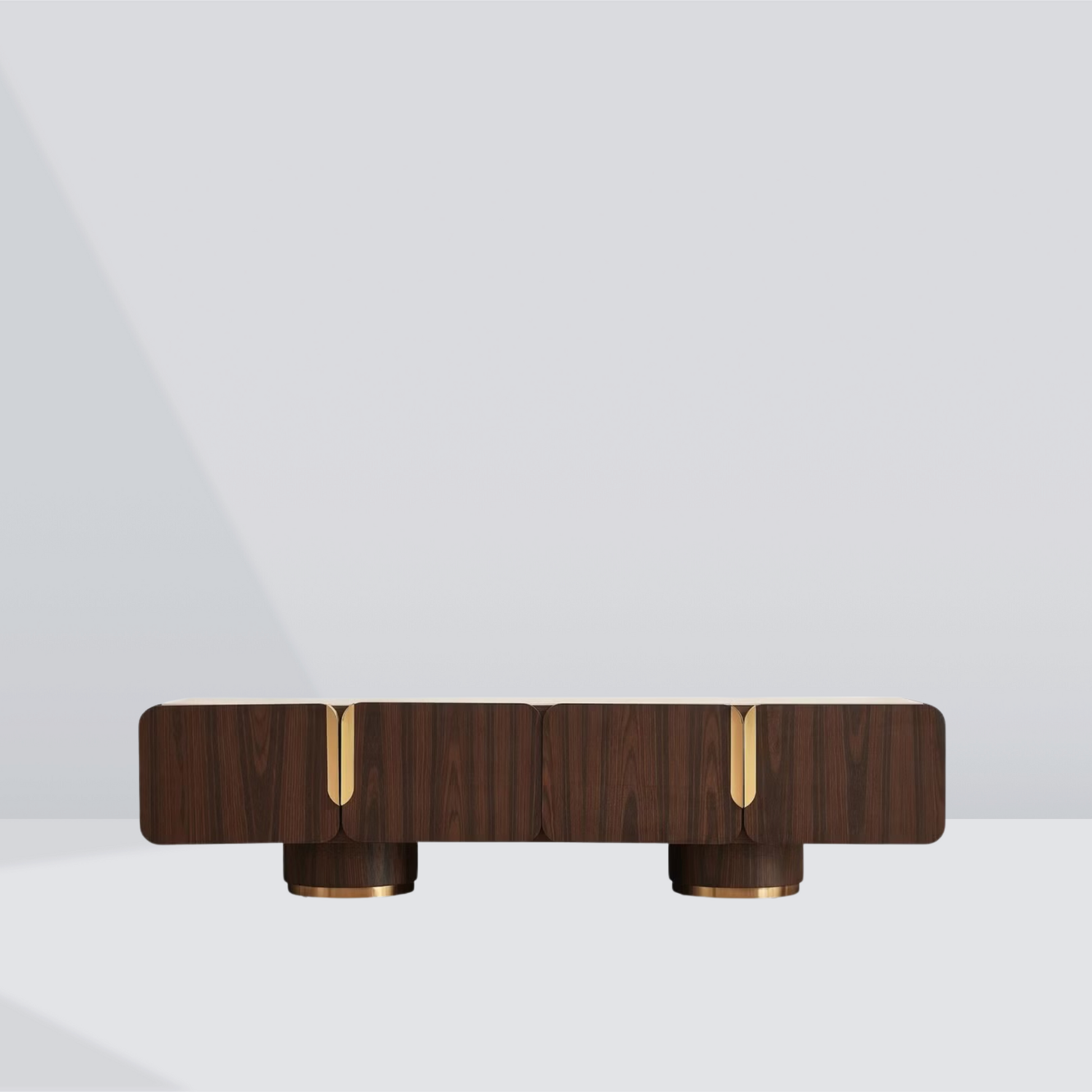 Introduce a statement of refined elegance with the Valente Tv Unit—a masterfully designed TV unit that captures the balance between modern design and luxurious detail. With its smooth walnut wood finish, soft rounded edges, and brushed gold accents, this piece elevates any space with an artful presence. Resting on sculptural cylindrical legs and topped with a ceramic slab, it offers both beauty and durability—ideal for contemporary homes seeking a bold yet functional centerpiece.